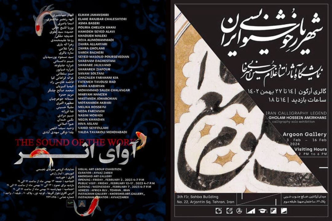 نمایشگاه آثار خوشنویسی غلامحسین امیرخانی در گالری آرگون و نمایشگاه گروهی «آوای اثر» با شركت 29 هنرمند در گالری خورشید روز جمعه 13 بهمن ماه برگزار میشود.